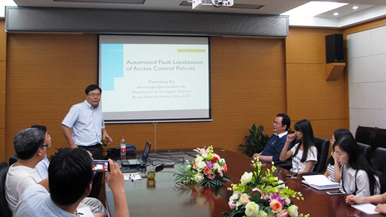 应av影片孙昌爱教授邀请,美国博伊西州立大学(Boise State University)徐殿祥教授来我校进行为期7天的学术交流与合作。2016年6月28日下午,徐殿祥教授在机电信息楼601作了题为“访问控制策略的自动化故障定位”的学术报告。报告会由孙昌爱教授主持,20余名师生参加了报告会。