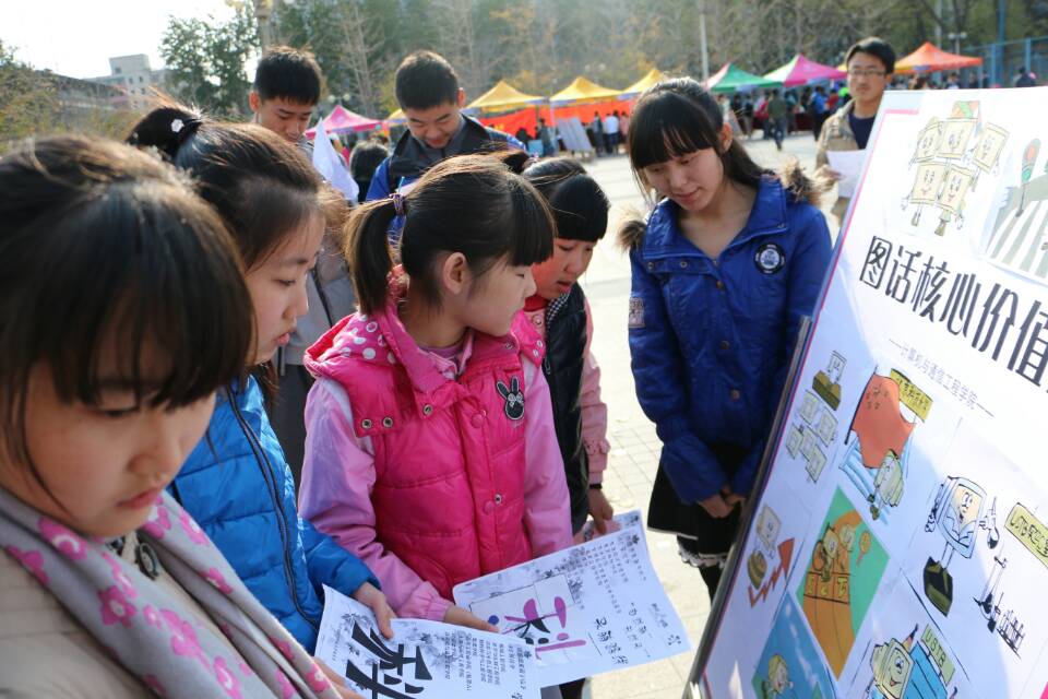 第二届科技游园会上,一个可爱的电脑人卡通形象很受欢迎,“为电脑人正能量点赞”,“看卡通人行为猜价值观准则”等活动引导了路过师生的关注和参与。这个电脑人是av影片