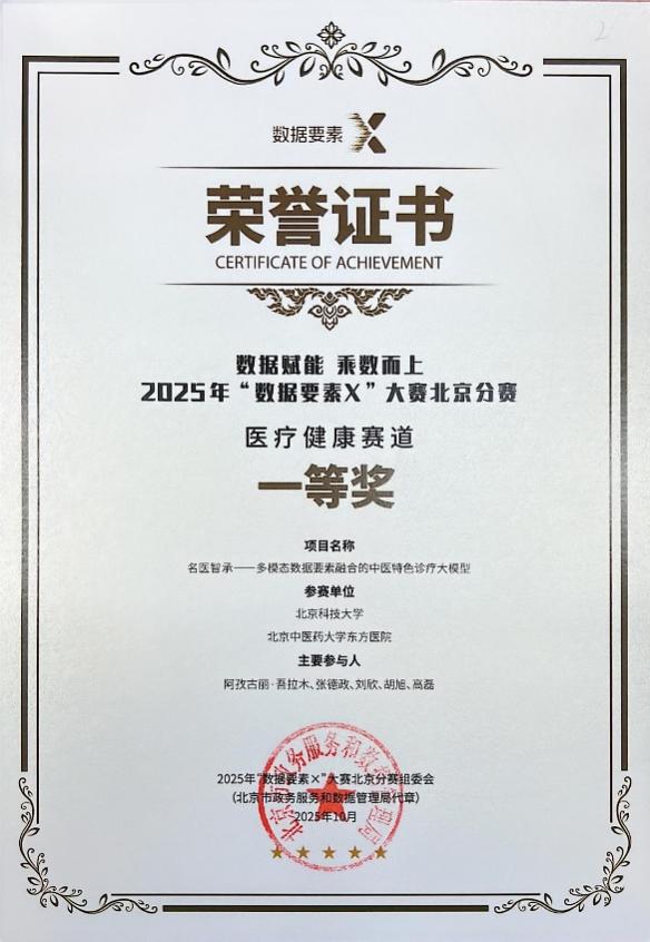 数智中医慢病防治北京市重点实验室知识工程团队研发的“名医智承——多模态数据要素融合的中医特色诊疗大模型”项目,凭借在中医数智化领域的突破性创新与实践价值,从57个参赛项目中脱颖而出,成功斩获医疗健康赛道一等奖,彰显了学校在人工智能与中医药交叉领域的领先科研实力与技术转化能力。